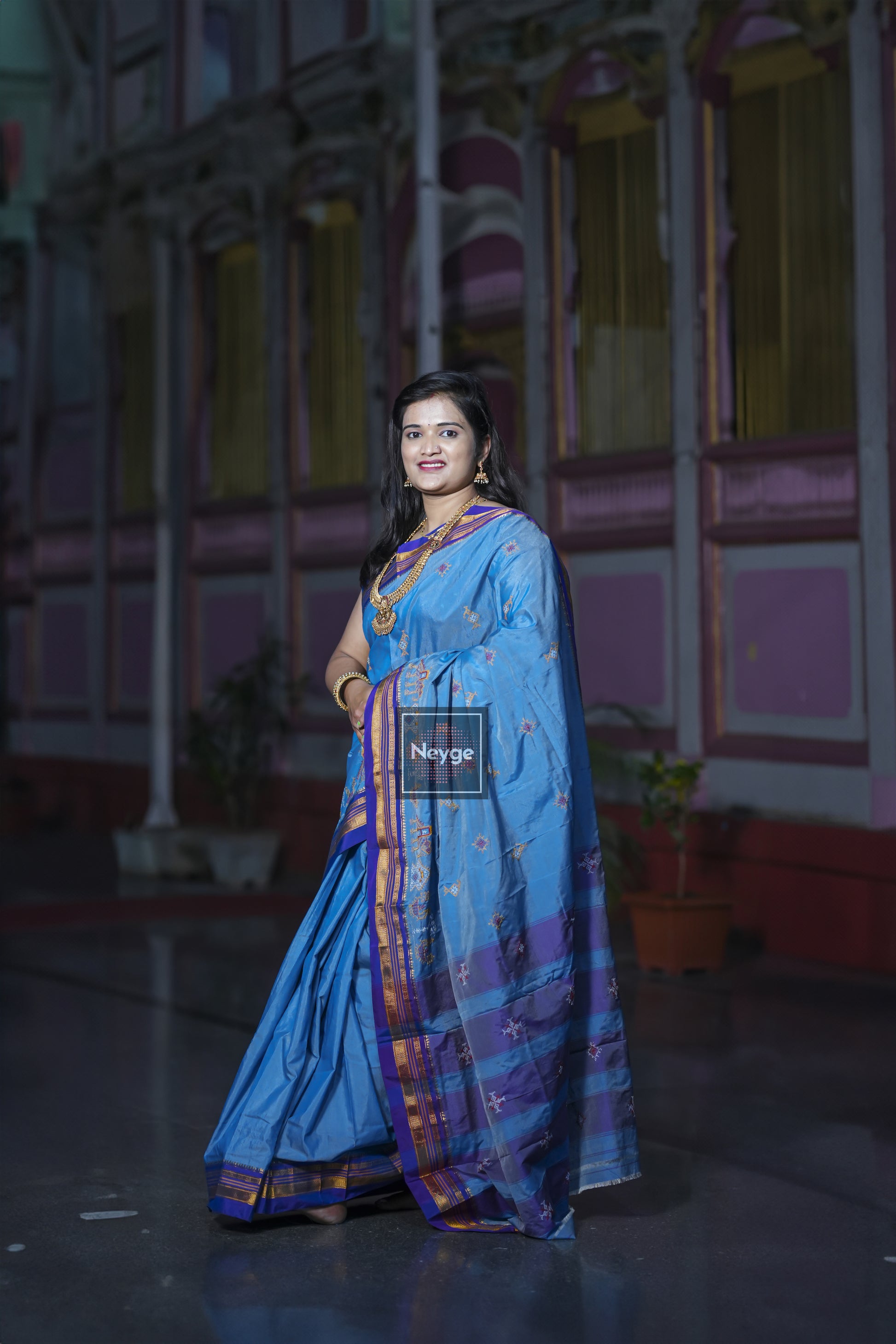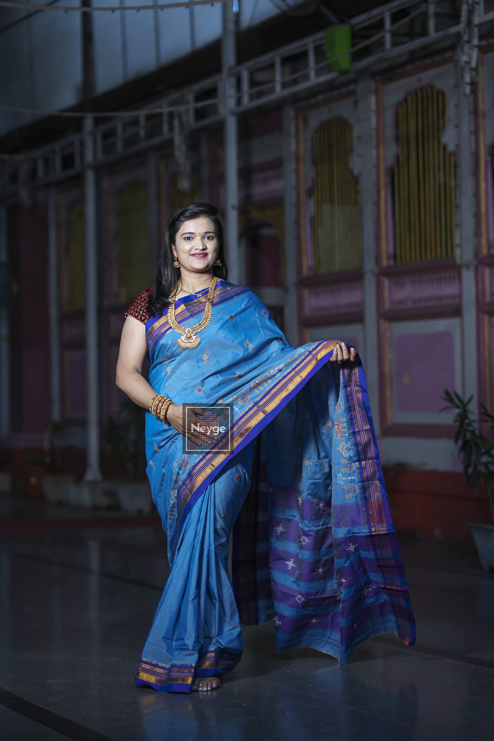 Ilkal Cotton Silk Blend Dharwad Kasuti Handwoven Traditional Border Stripe Pallu Saree - Blue