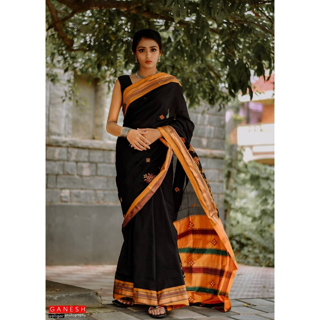 A stunning example of traditional craftsmanship, this saree boasts Kasuti work which is a rich cultural heritage and craftsmanship of Karnataka. This Ilkal Kasuti silk blend saree has a Gomi border and kasuti work on the body. The fabric is woven with cotton and silk and contains machine Kasuti work. The Kasuti work often include motifs inspired by nature, such as flowers, birds, and animals. It is traditionally done in bright and contrasting colors, which makes the sarees visually appealing.. This saree looks cotton silky and feels like a silk saree. Whether it's summer or winter, they feel soft and nice against the skin.