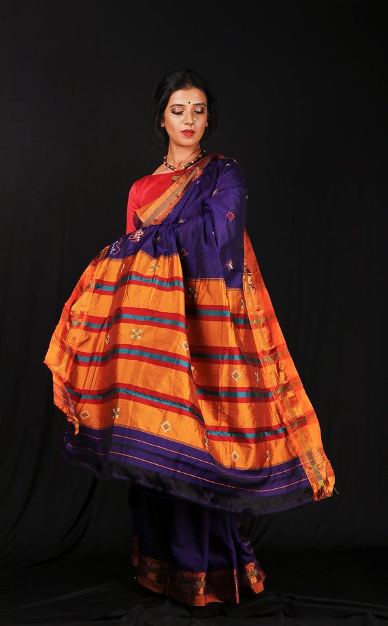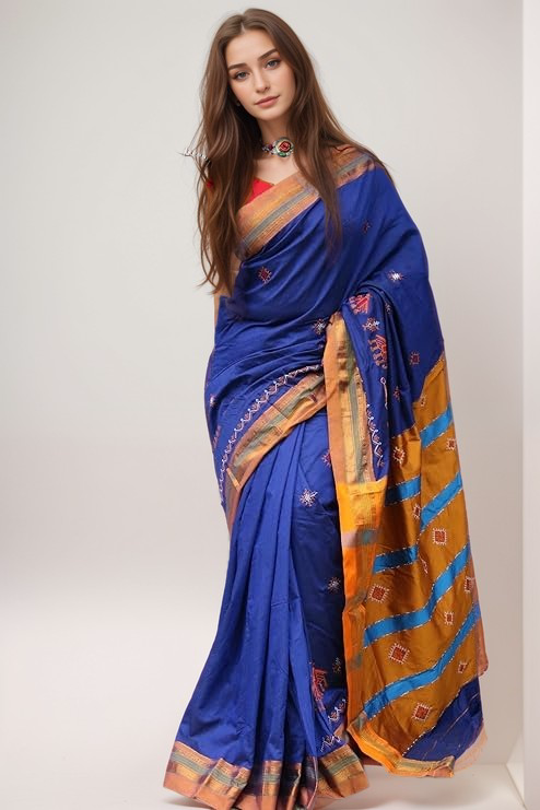 A stunning example of traditional craftsmanship, this saree boasts Kasuti work which is a rich cultural heritage and craftsmanship of Karnataka. This Ilkal Kasuti silk blend saree has a Gomi border and kasuti work on the body. The fabric is woven with cotton and silk and contains machine Kasuti work. The Kasuti work often include motifs inspired by nature, such as flowers, birds, and animals. It is traditionally done in bright and contrasting colors, which makes the sarees visually appealing.. This saree looks cotton silky and feels like a silk saree. Whether it's summer or winter, they feel soft and nice against the skin.
