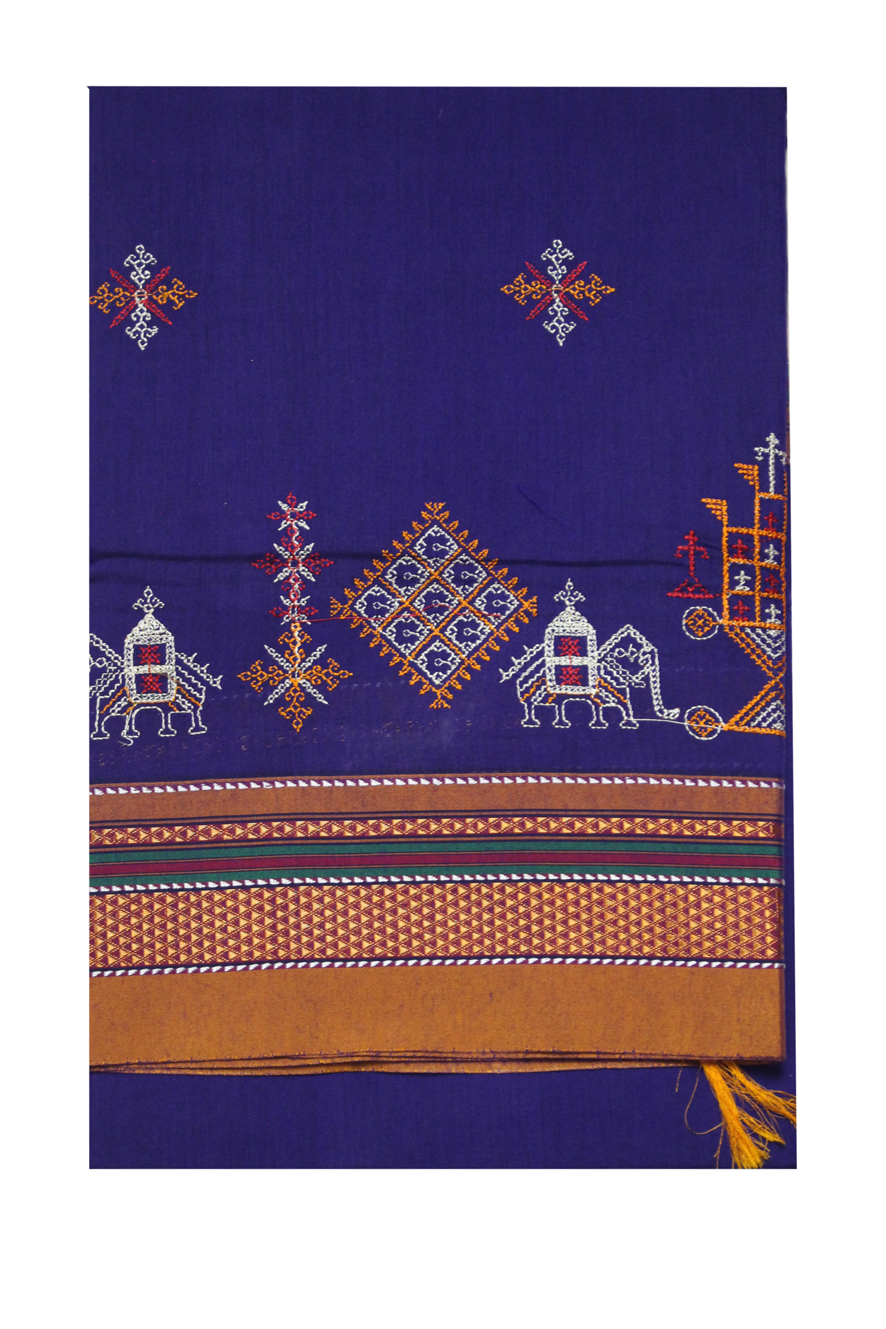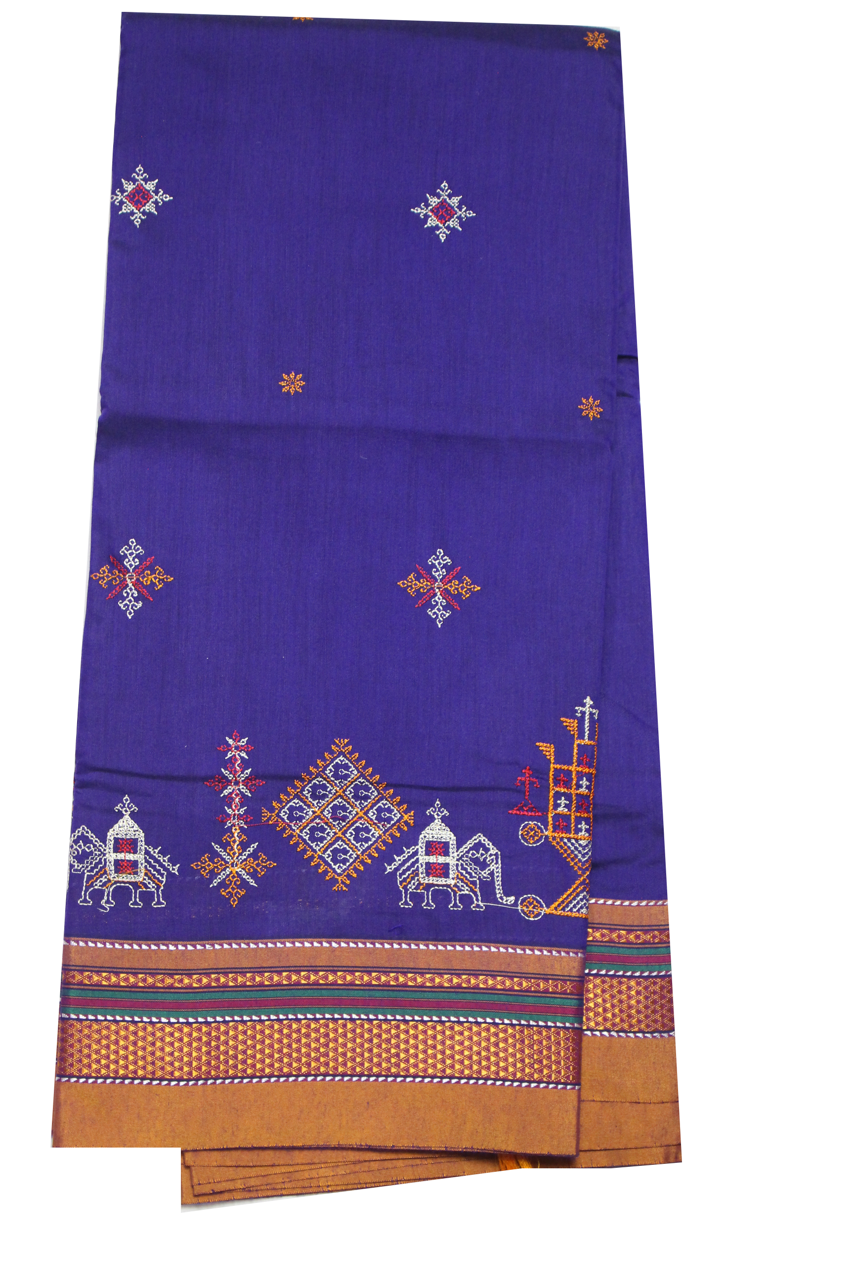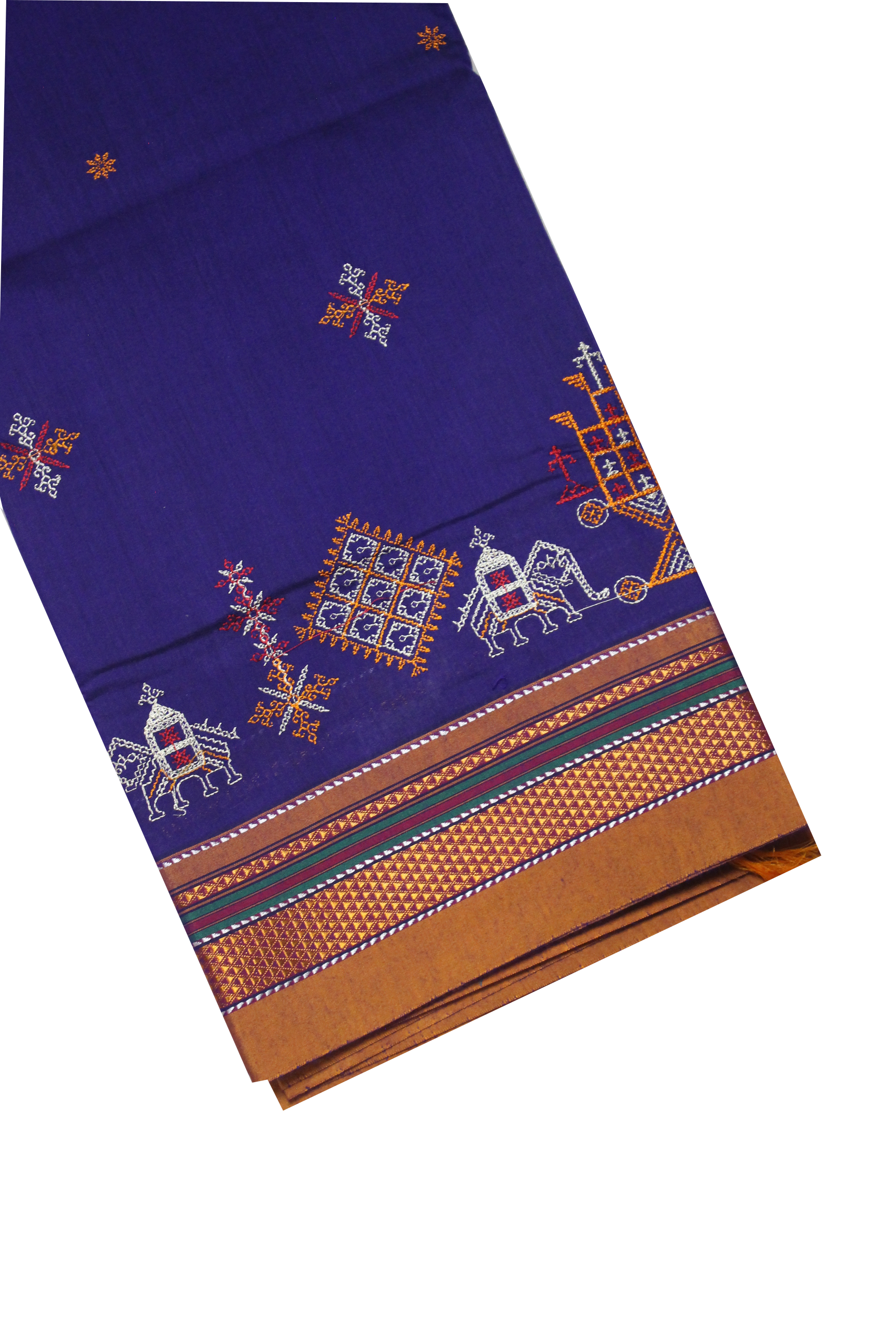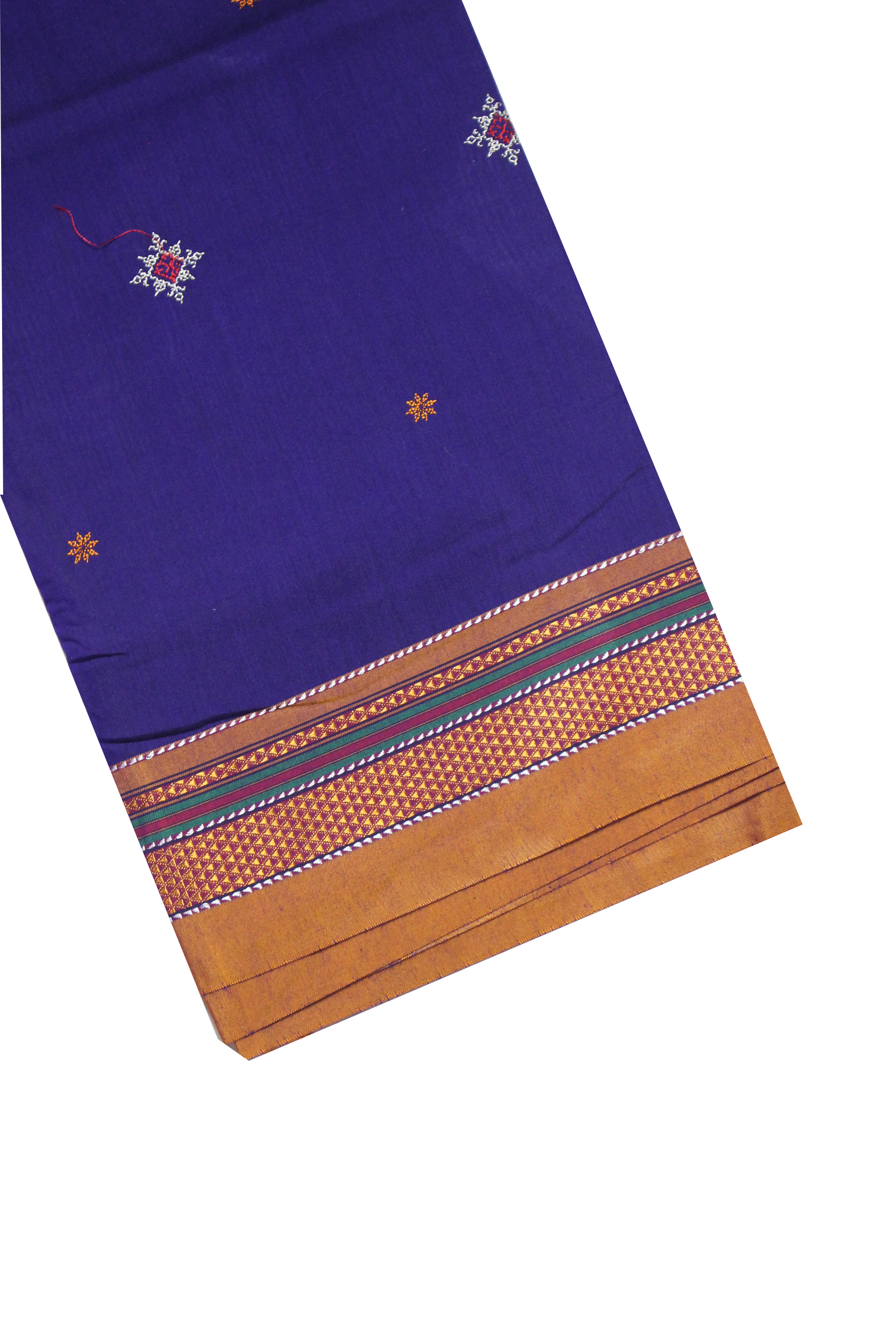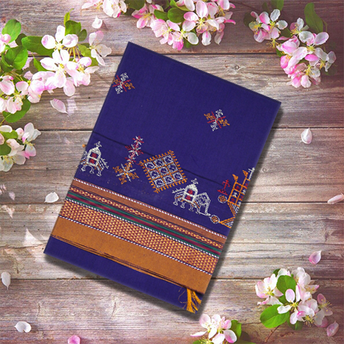 Crafted with precision, Kasuti saree showcases the rich cultural heritage and craftsmanship of Karnataka which are cherished for their beauty and uniqueness. This Ilkal Kasuti silk blend saree has a chikki paras border and kasuti work on the body. The fabric is woven with cotton and silk and contains machine Kasuti work. The Kasuti work often include motifs inspired by nature, such as flowers, birds, and animals. It is traditionally done in bright and contrasting colors, which makes the sarees visually appealing.. This saree looks cotton silky and feels like a silk saree. Whether it's summer or winter, they feel soft and nice against the skin.
