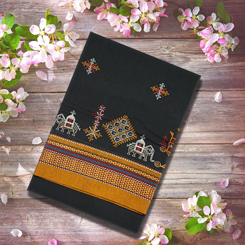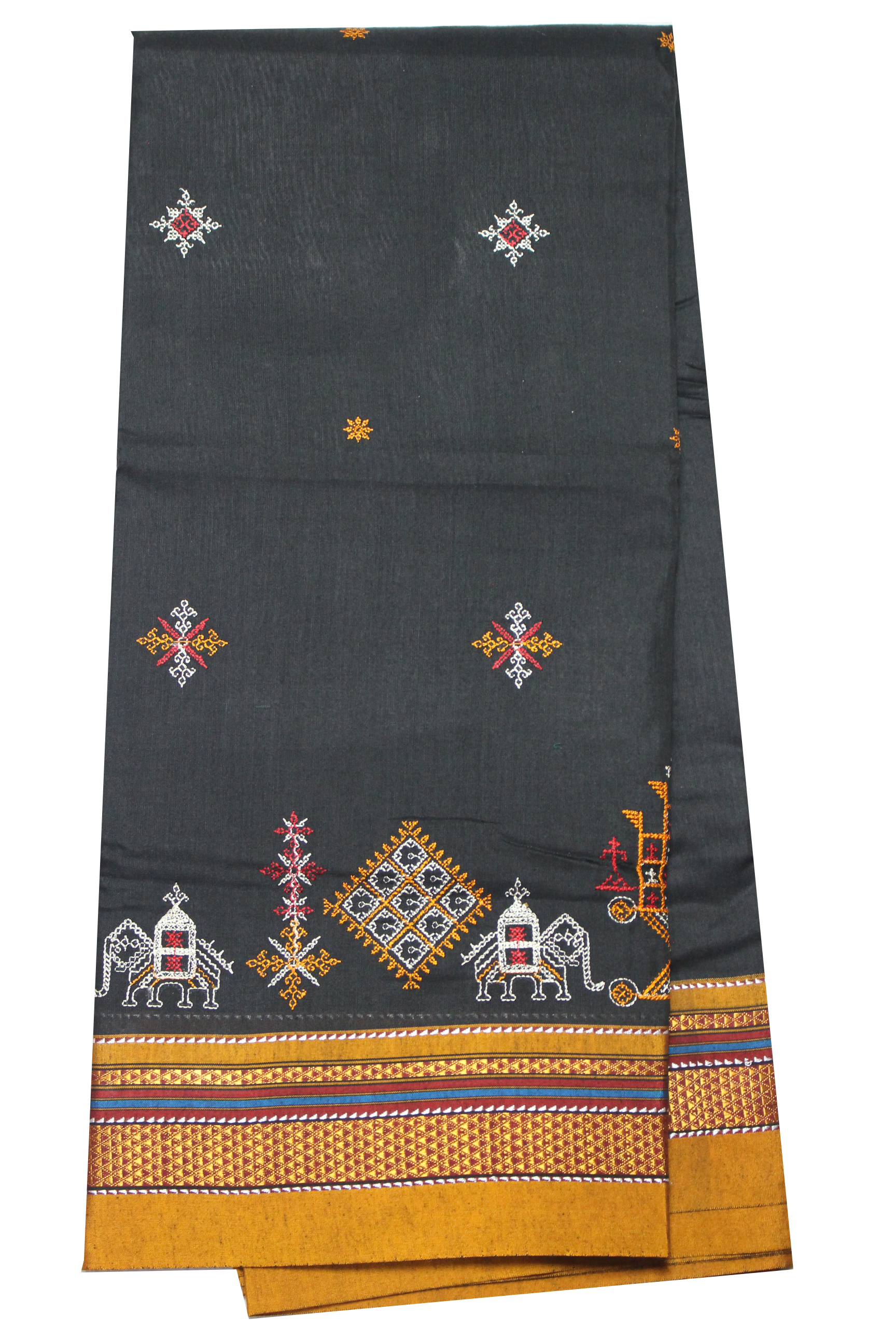 Crafted with precision, Kasuti saree showcases the rich cultural heritage and craftsmanship of Karnataka which are cherished for their beauty and uniqueness. This Ilkal Kasuti silk blend saree has a chikki paras border and kasuti work on the body. The fabric is woven with cotton and silk and contains machine Kasuti work. The Kasuti work often include motifs inspired by nature, such as flowers, birds, and animals. It is traditionally done in bright and contrasting colors, which makes the sarees visually appealing.. This saree looks cotton silky and feels like a silk saree. Whether it's summer or winter, they feel soft and nice against the skin.