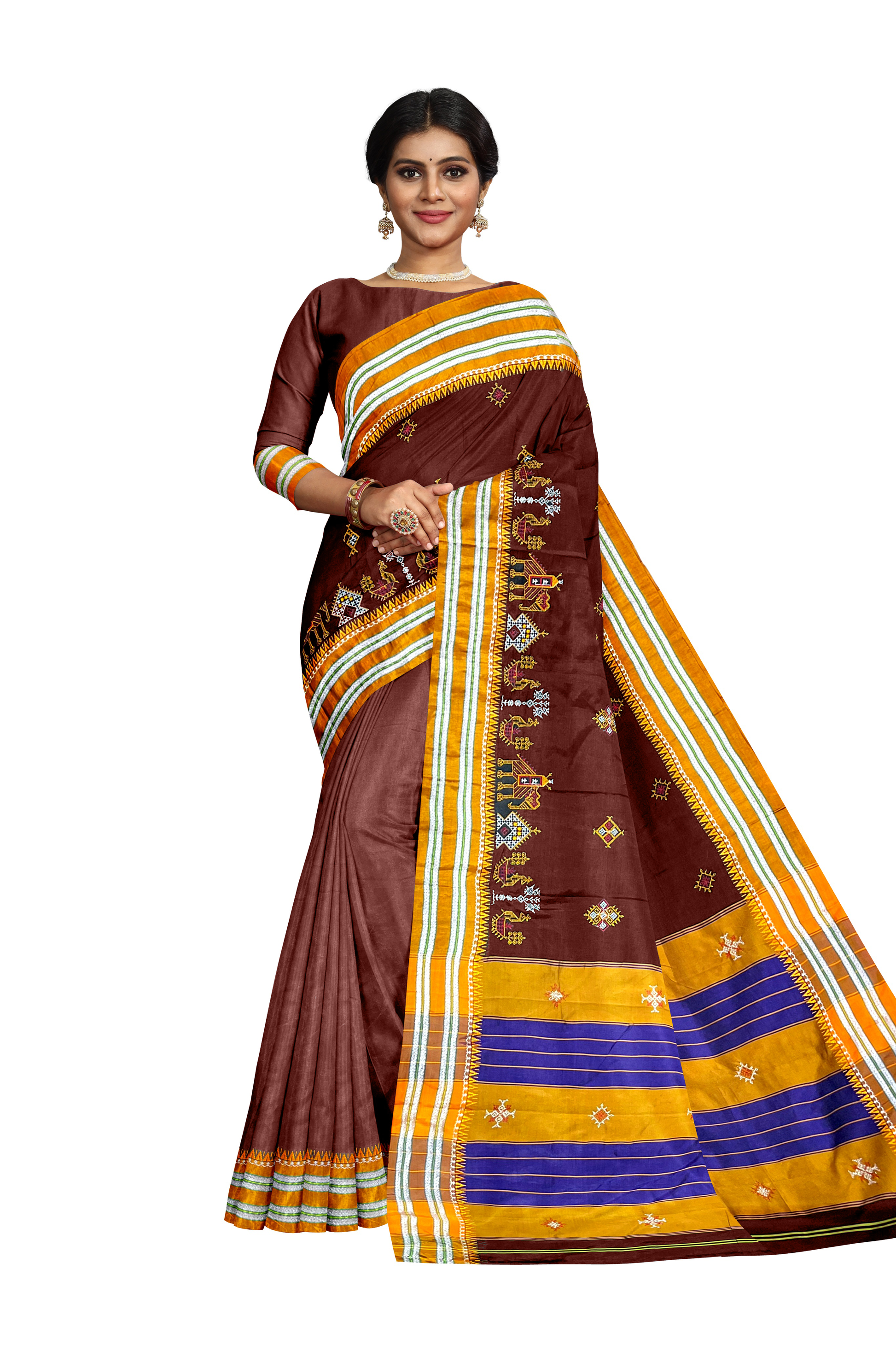 Neyge Ilkal Handwoven Cotton Silk Blend Kasuti Gomi Dadi Traditional Border Stripe Pallu Saree - Brown