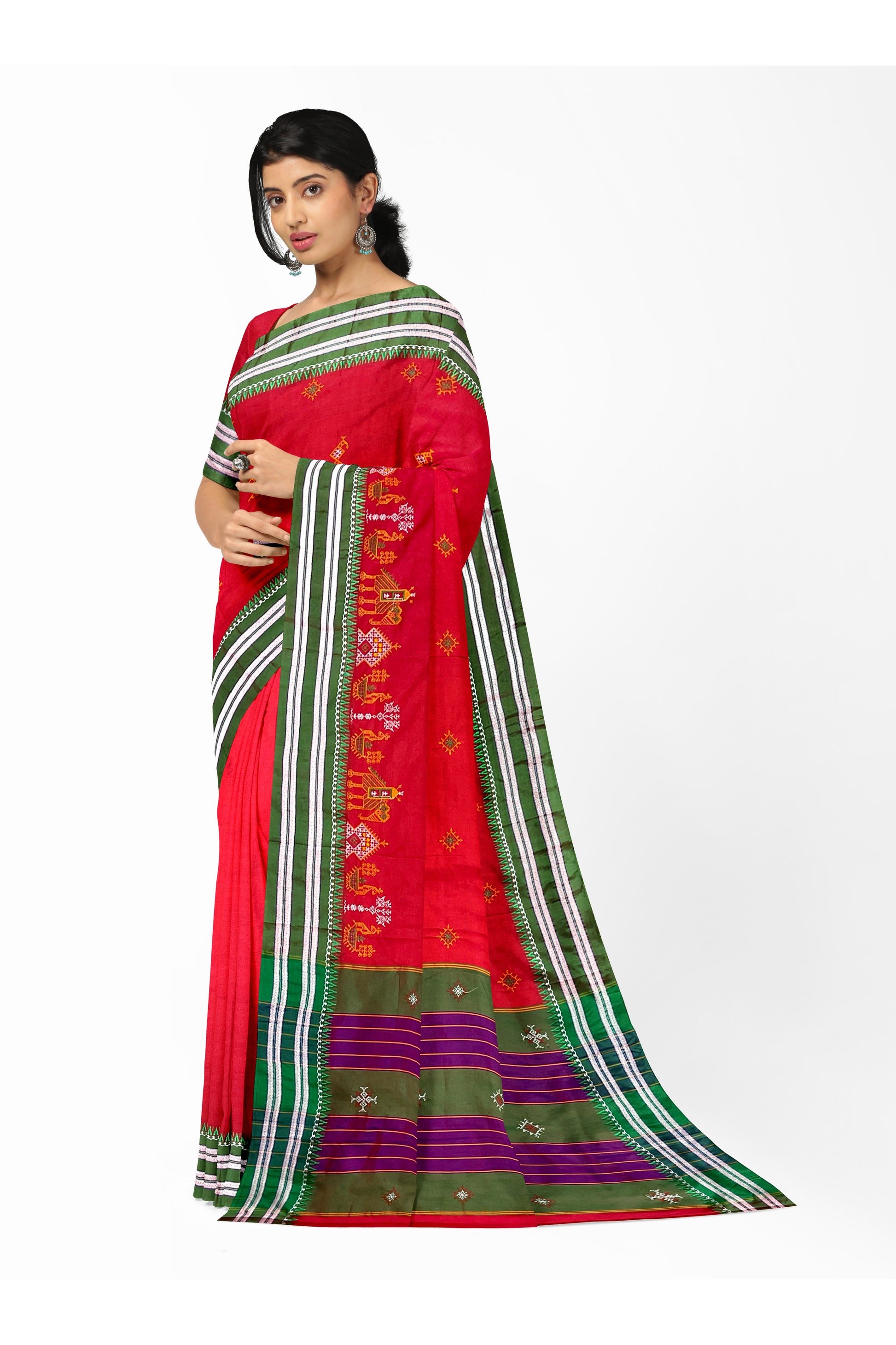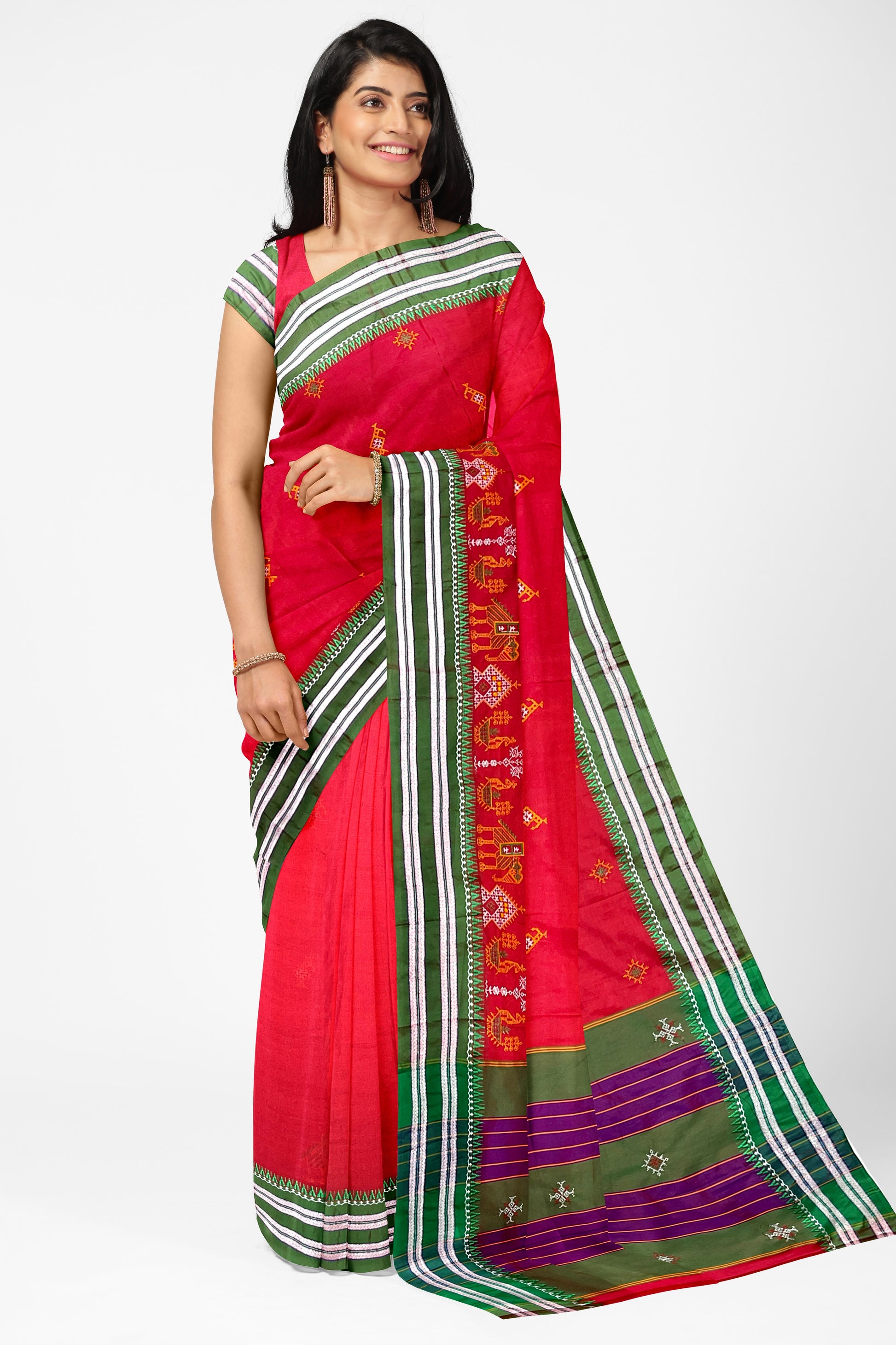 Neyge Ilkal Handwoven Cotton Silk Blend Kasuti Gomi Dadi Traditional Border Stripe Pallu Saree - Red