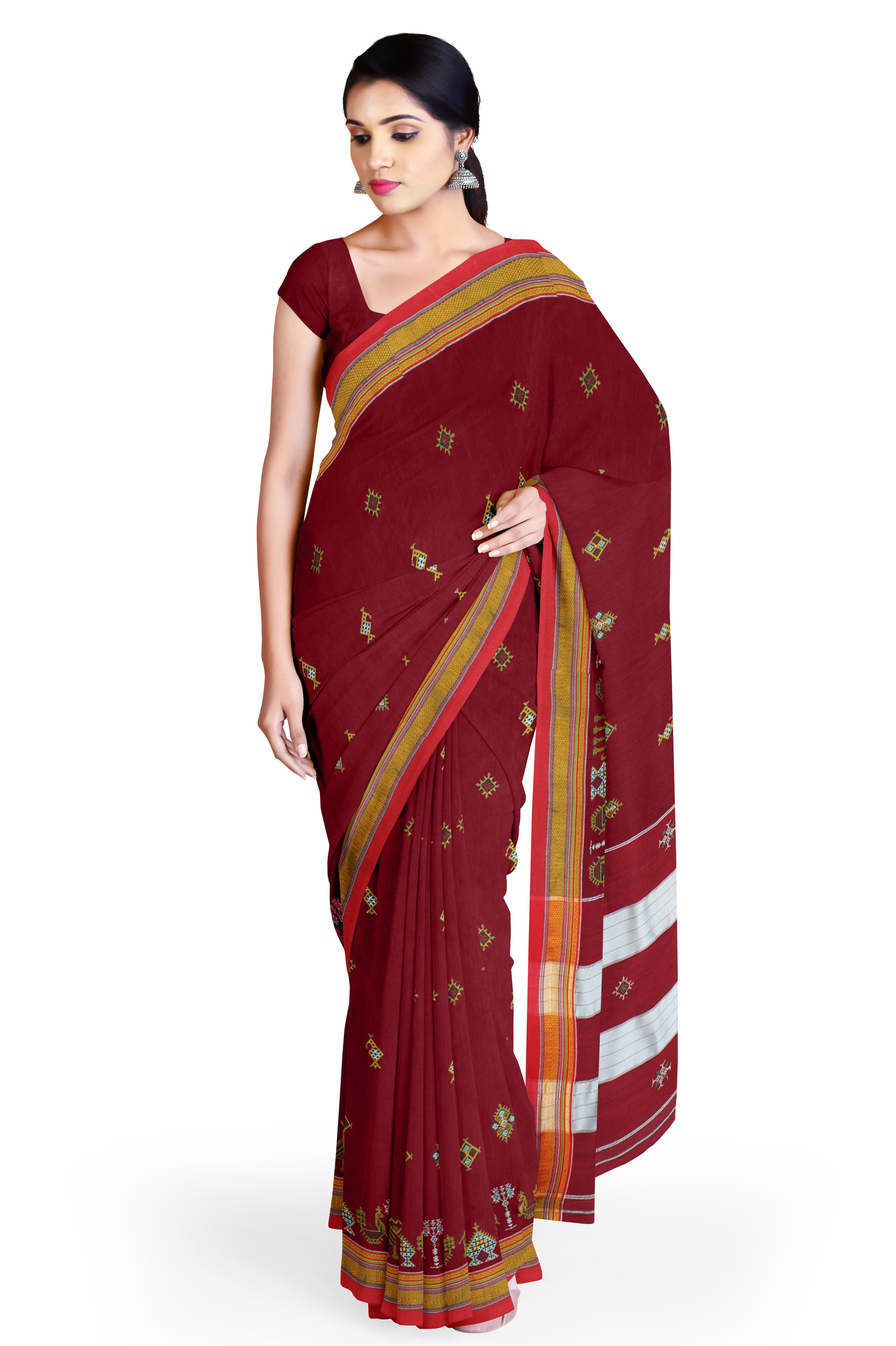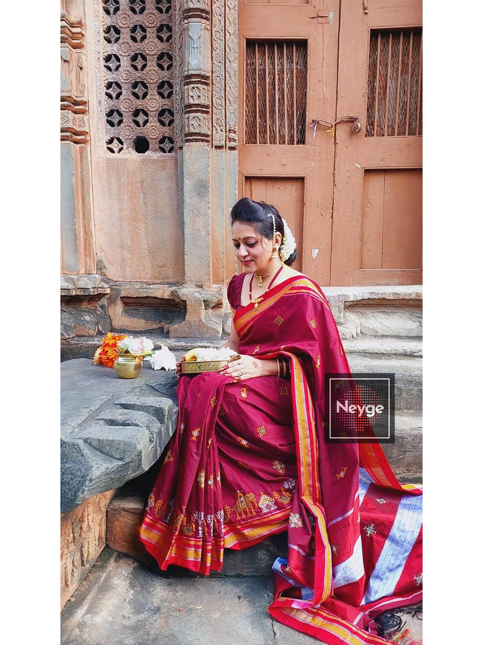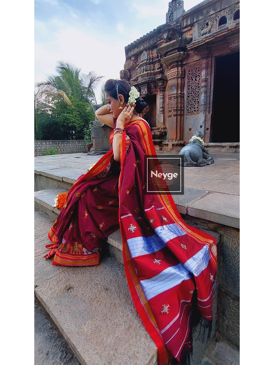 The graceful drape of this saree is complemented by Kasuti work known for its intricate and detailed embroidery work usually done in vibrant colors. Kasuti embroidery is characterized by geometric and animal patterns which are inspired by nature. This Ilkal Kasuti Cotton silk saree has a chikki paras border. The fabric is woven with cotton and silk and contains machine Kasuti work. This saree looks cotton silky and feels like a silk saree. Whether it's summer or winter, they feel soft and nice against the skin.