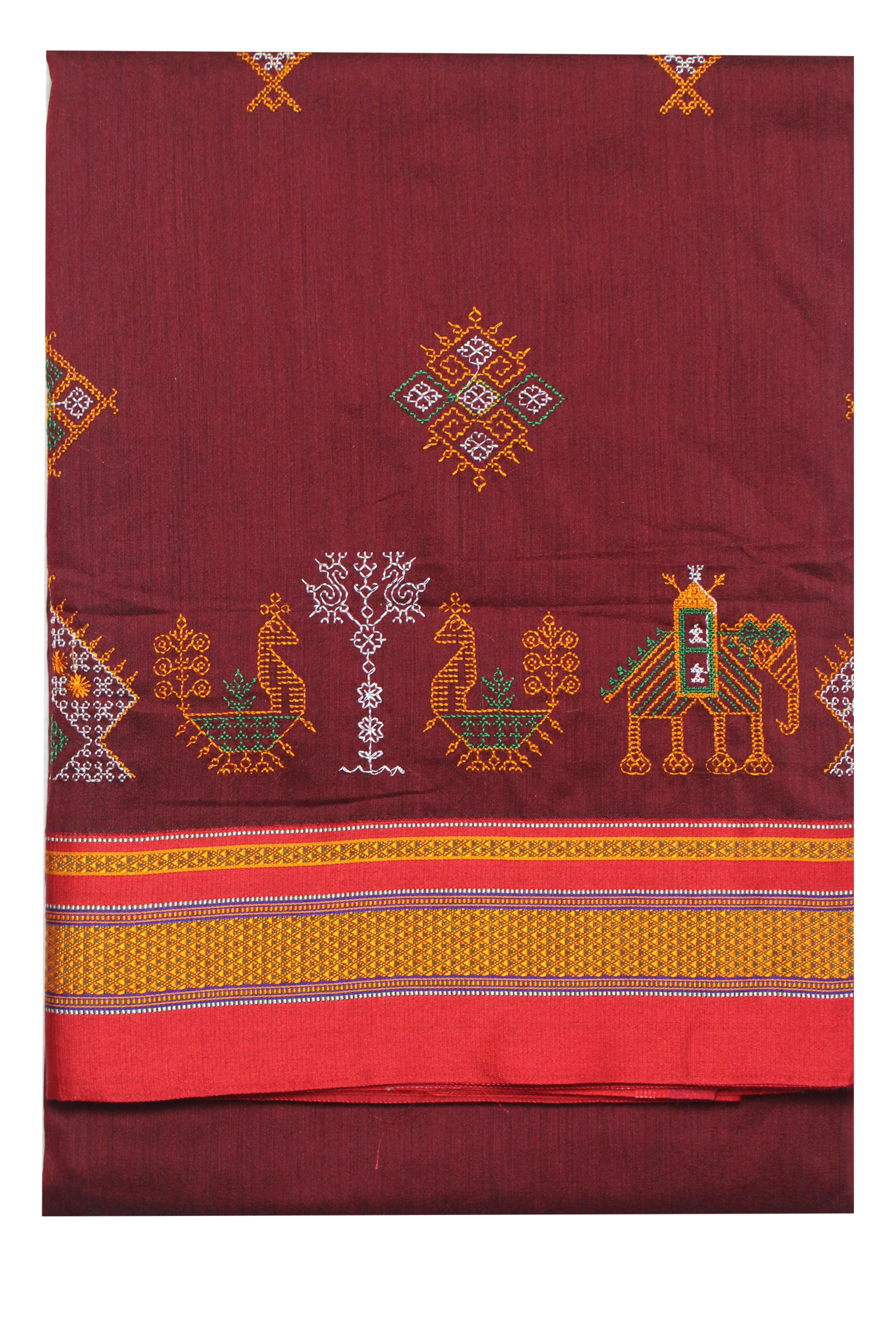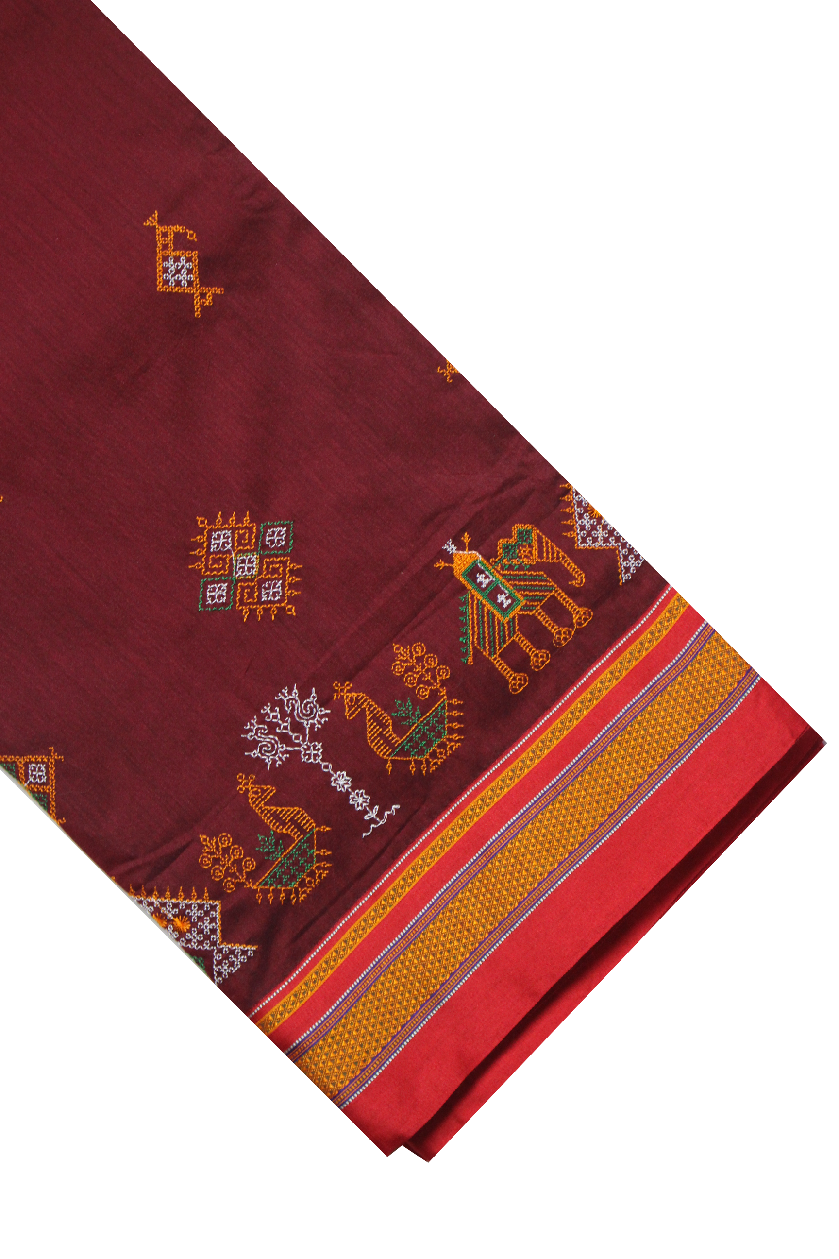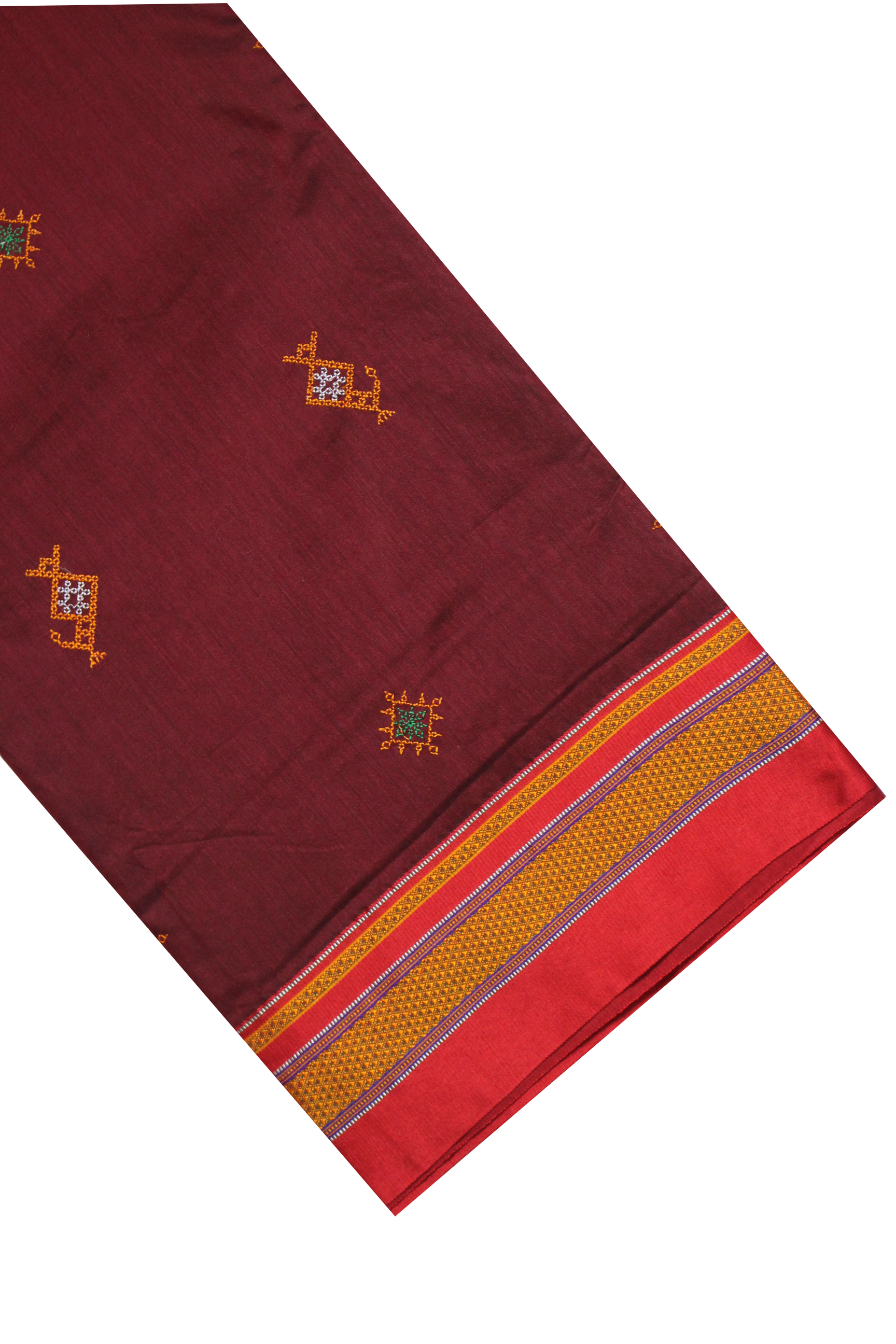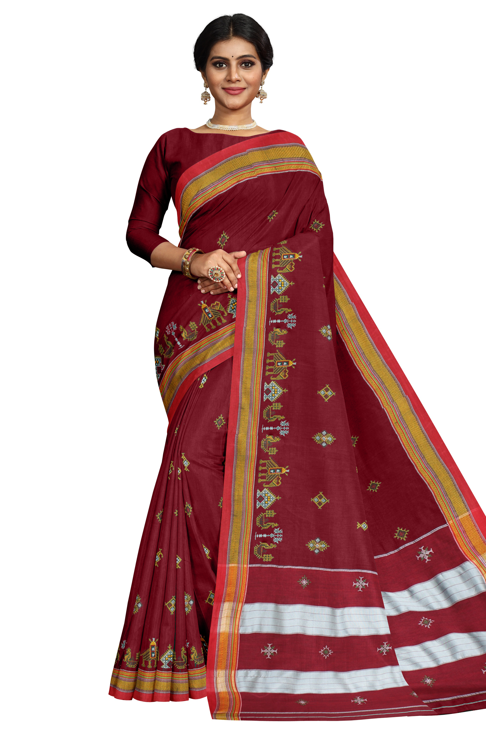 The graceful drape of this saree is complemented by Kasuti work known for its intricate and detailed embroidery work usually done in vibrant colors. Kasuti embroidery is characterized by geometric and animal patterns which are inspired by nature. This Ilkal Kasuti Cotton silk saree has a chikki paras border. The fabric is woven with cotton and silk and contains machine Kasuti work. This saree looks cotton silky and feels like a silk saree. Whether it's summer or winter, they feel soft and nice against the skin.