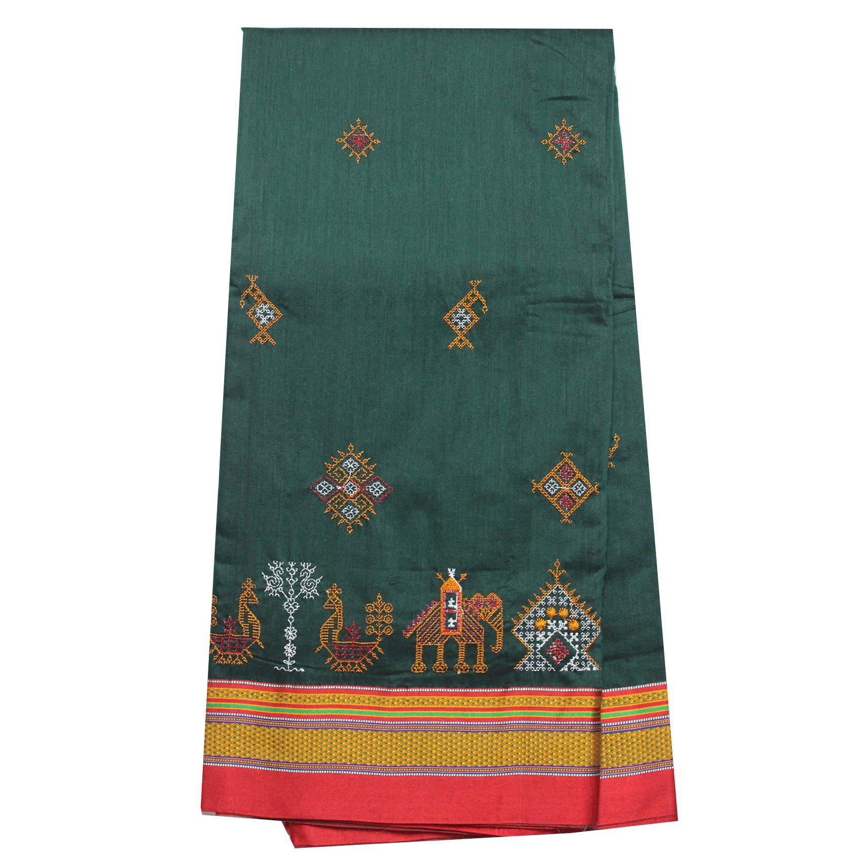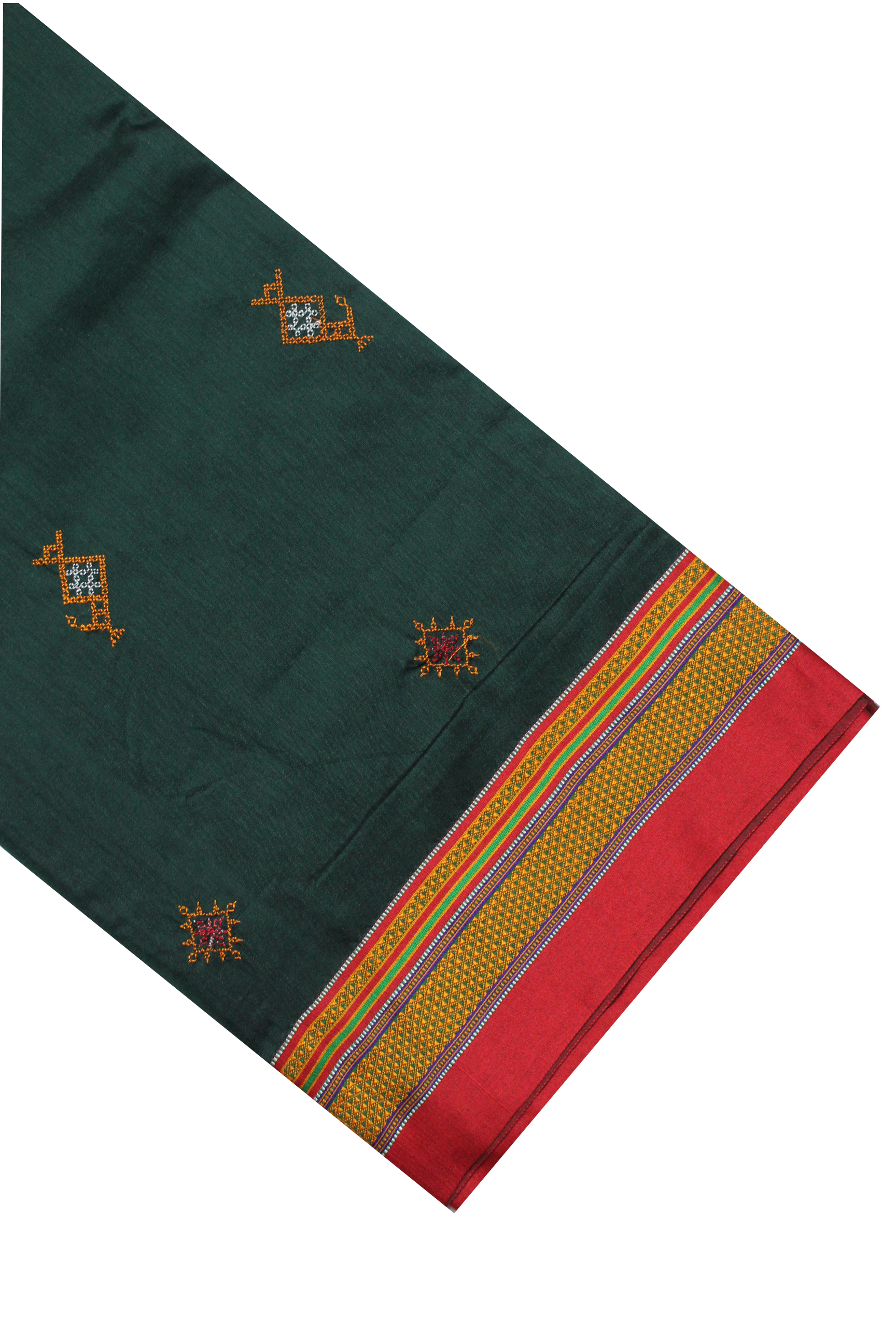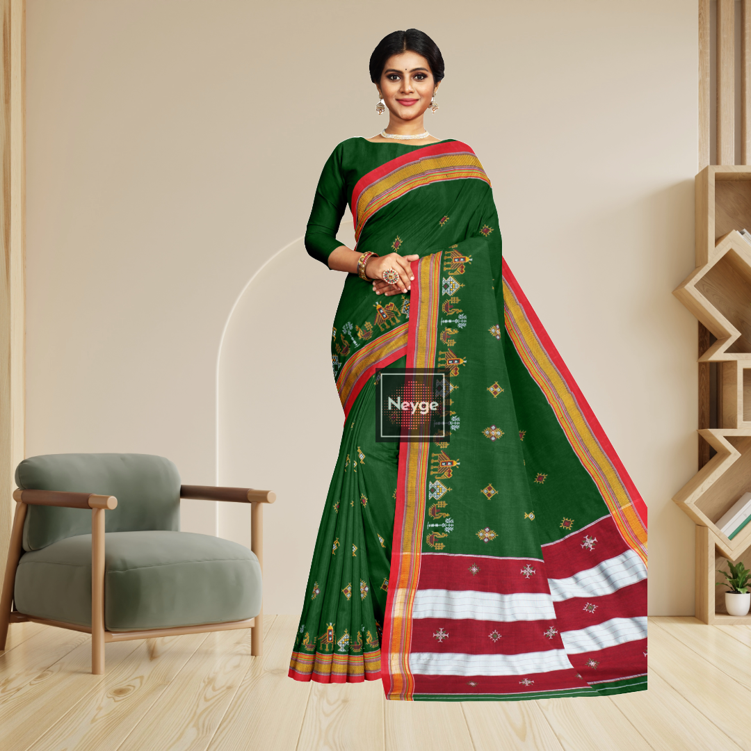 The graceful drape of this saree is complemented by Kasuti work known for its intricate and detailed embroidery work usually done in vibrant colors. Kasuti embroidery is characterized by geometric and animal patterns which are inspired by nature. This Ilkal Kasuti Cotton silk saree has a chikki paras border. The fabric is woven with cotton and silk and contains machine Kasuti work. This saree looks cotton silky and feels like a silk saree. Whether it's summer or winter, they feel soft and nice against the skin.