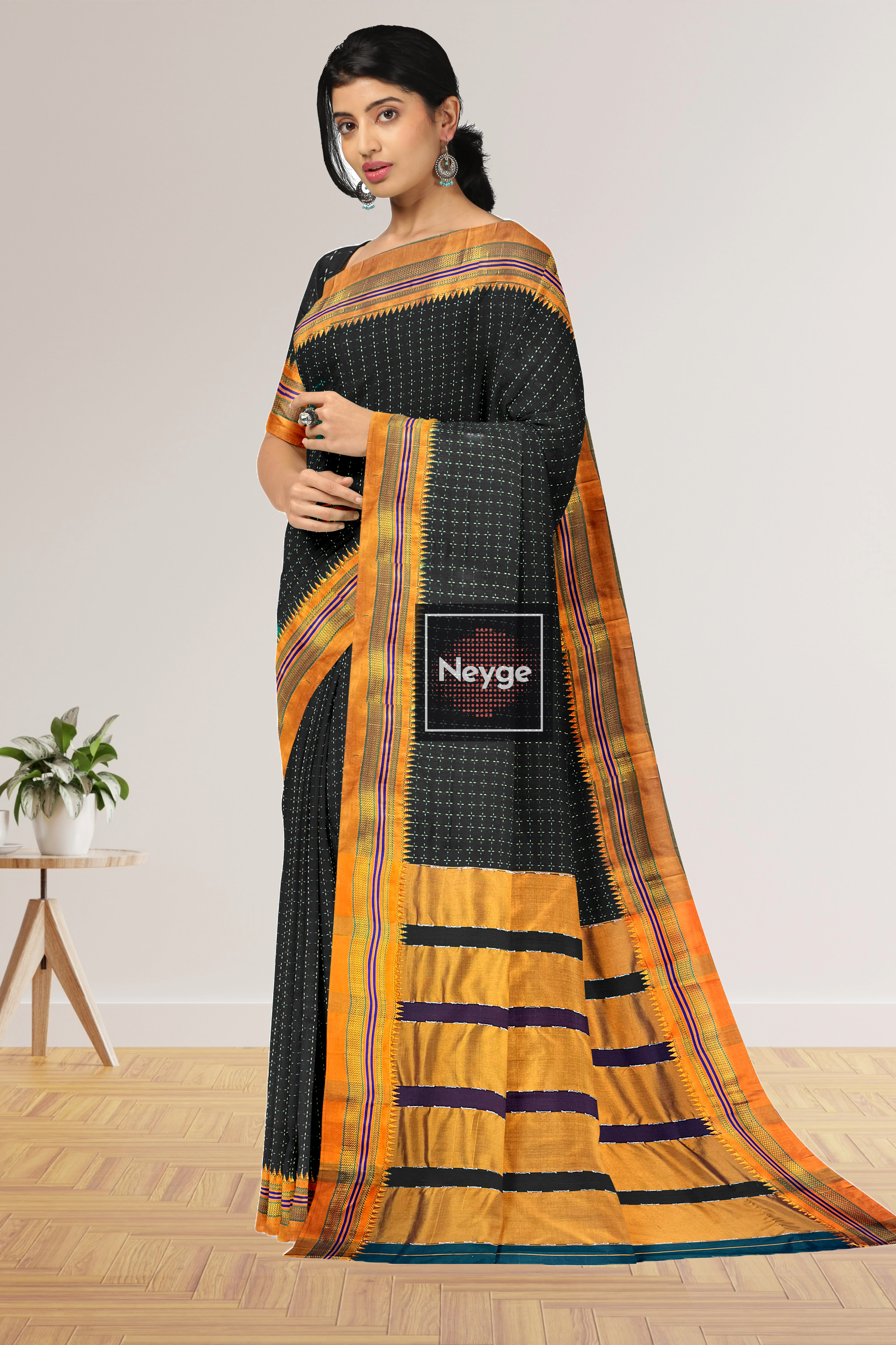 Neyge Ilkal Handwoven Cotton Silk Star Patterened Traditional Satin Border Stripe Pallu Saree - Black