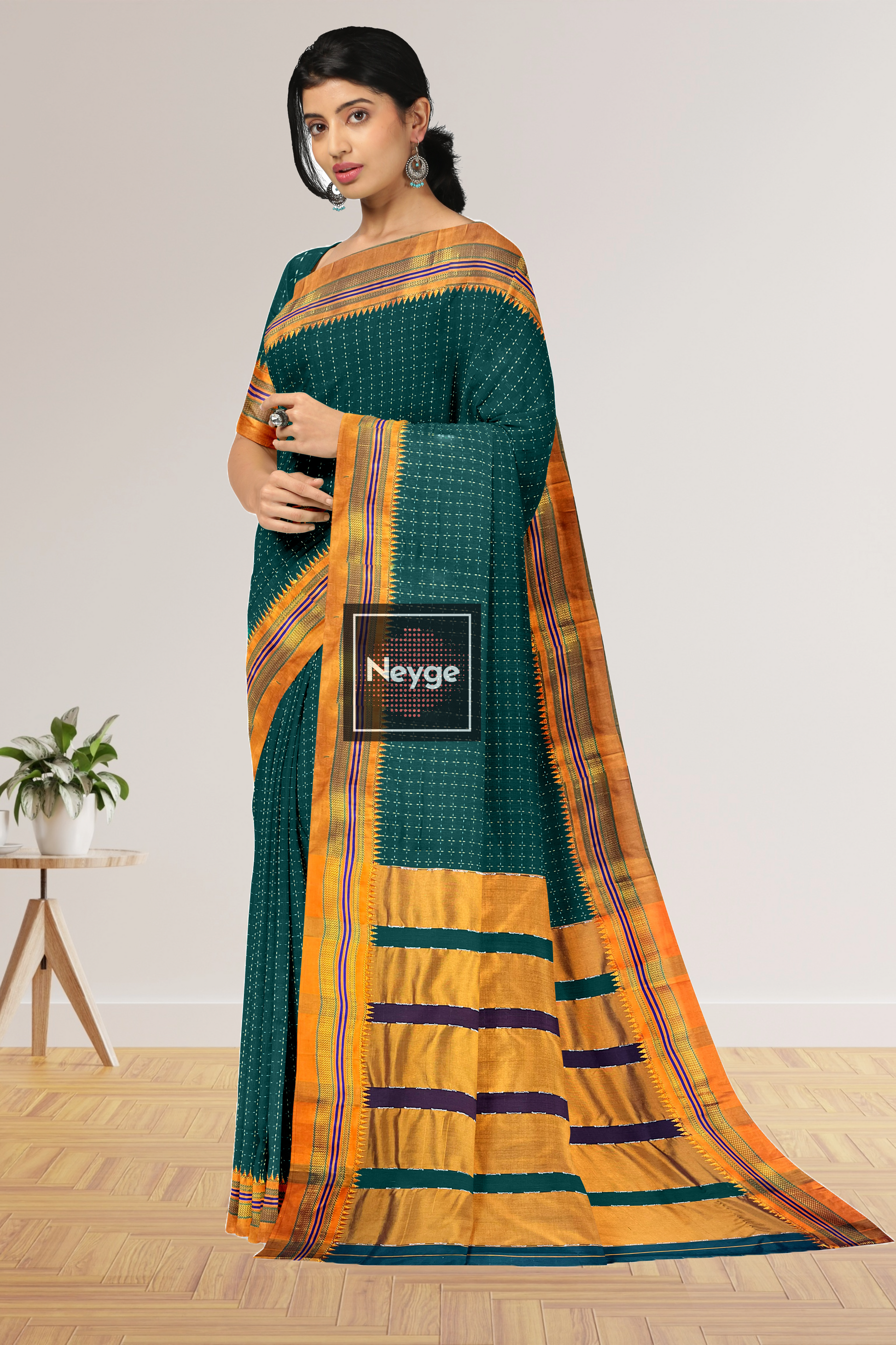 Neyge Ilkal Handwoven Cotton Silk Star Patterened Traditional Satin Border Stripe Pallu Saree - Green