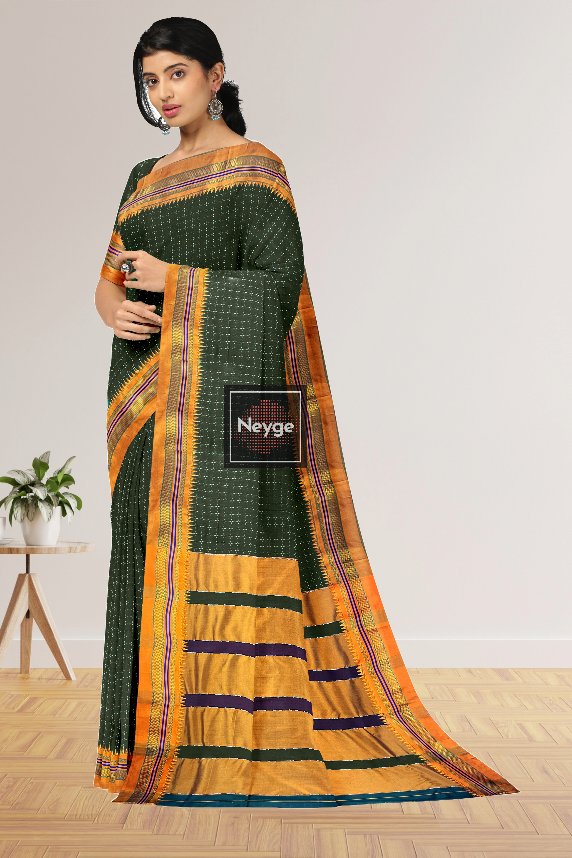Neyge Ilkal Handwoven Cotton Silk Star Patterened Traditional Satin Border Stripe Pallu Saree - Mehendi