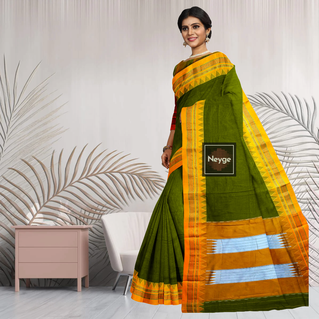 Neyge Ilkal Handwoven Masarai Cotton Silk Plain Body Traditional Temple Border Tope Pallu Saree - Mehendi