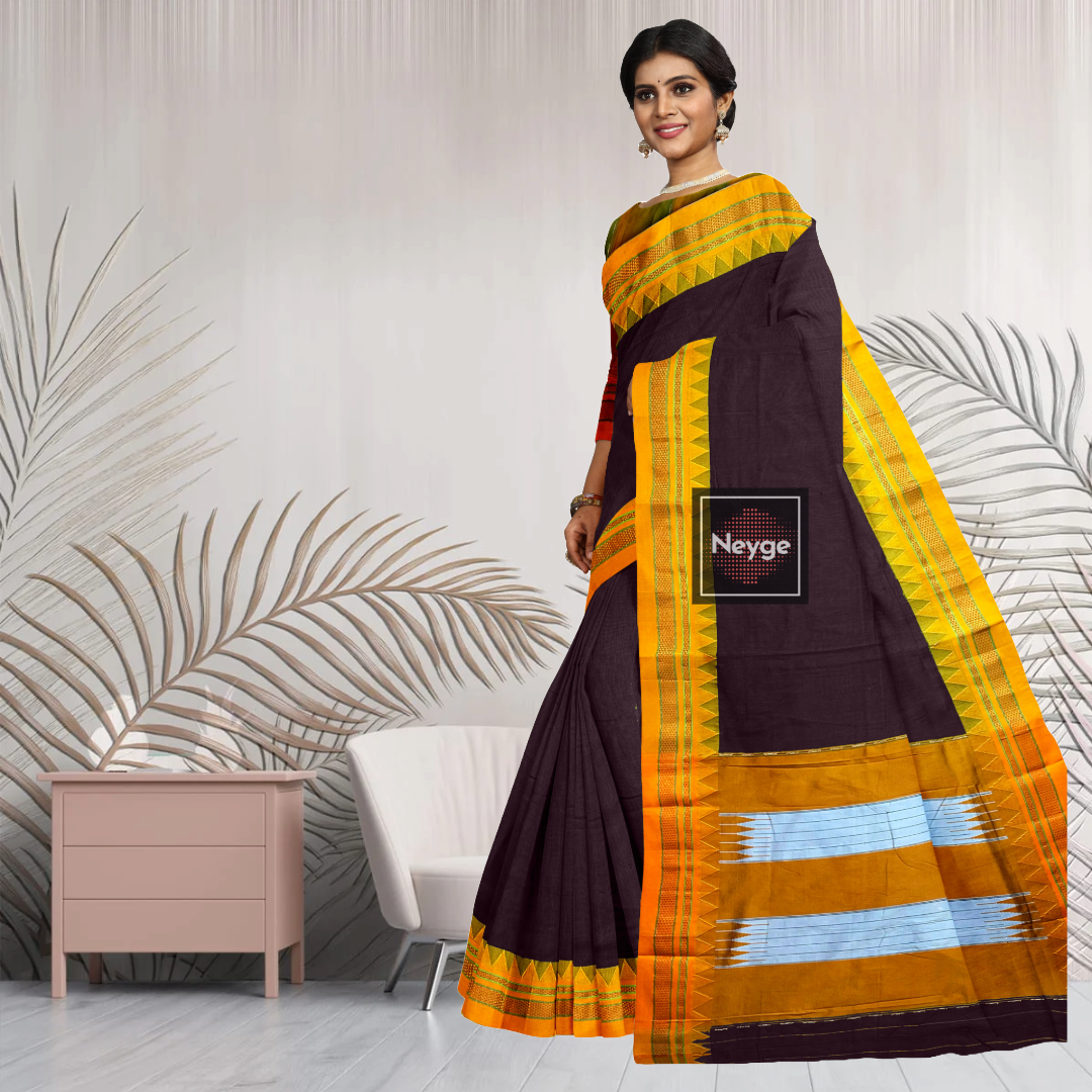 Neyge Ilkal Handwoven Masarai Cotton Silk Plain Body Traditional Temple Border Tope Pallu Saree - Wine
