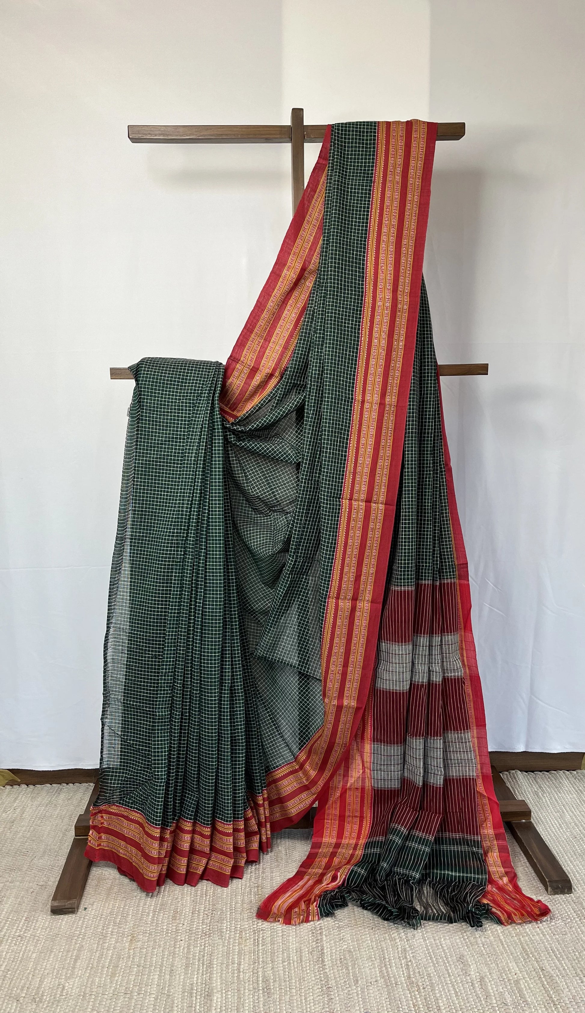 PATTEDA ANCHU weave from the 10th century! We are happy and proud to bring back the traditional sarees that have been worn in southern India since the 10th century. Pure Cotton Handloom - Eco-friendly colours - Reversible, wearable from either side - One saree takes 2 days to weave - Genuine Quality At weddings, this saree is presented to the local deity before being worn by the bride. This beautiful saree has a cotton weave, which can be recognised by its thickness, plain border, and subtle checks all throughout. Amazingly, this saree can be worn from either side, saving you the trouble of ironing and fall & beading. This saree was created with eco-friendly dyes.