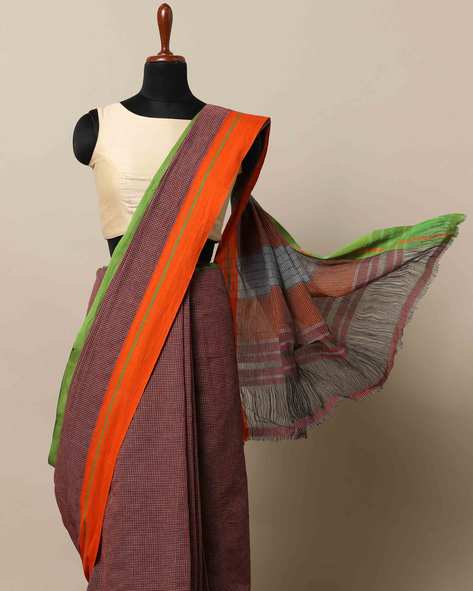 PATTEDA ANCHU weave from the 10th century! We are happy and proud to bring back the traditional sarees that have been worn in southern India since the 10th century. Pure Cotton Handloom - Eco-friendly colours - Reversible, wearable from either side - One saree takes 2 days to weave - Genuine Quality At weddings, this saree is presented to the local deity before being worn by the bride. This beautiful saree has a cotton weave, which can be recognised by its thickness, plain border, and subtle checks all throughout. Amazingly, this saree can be worn from either side, saving you the trouble of ironing and fall & beading. This saree was created with eco-friendly dyes.