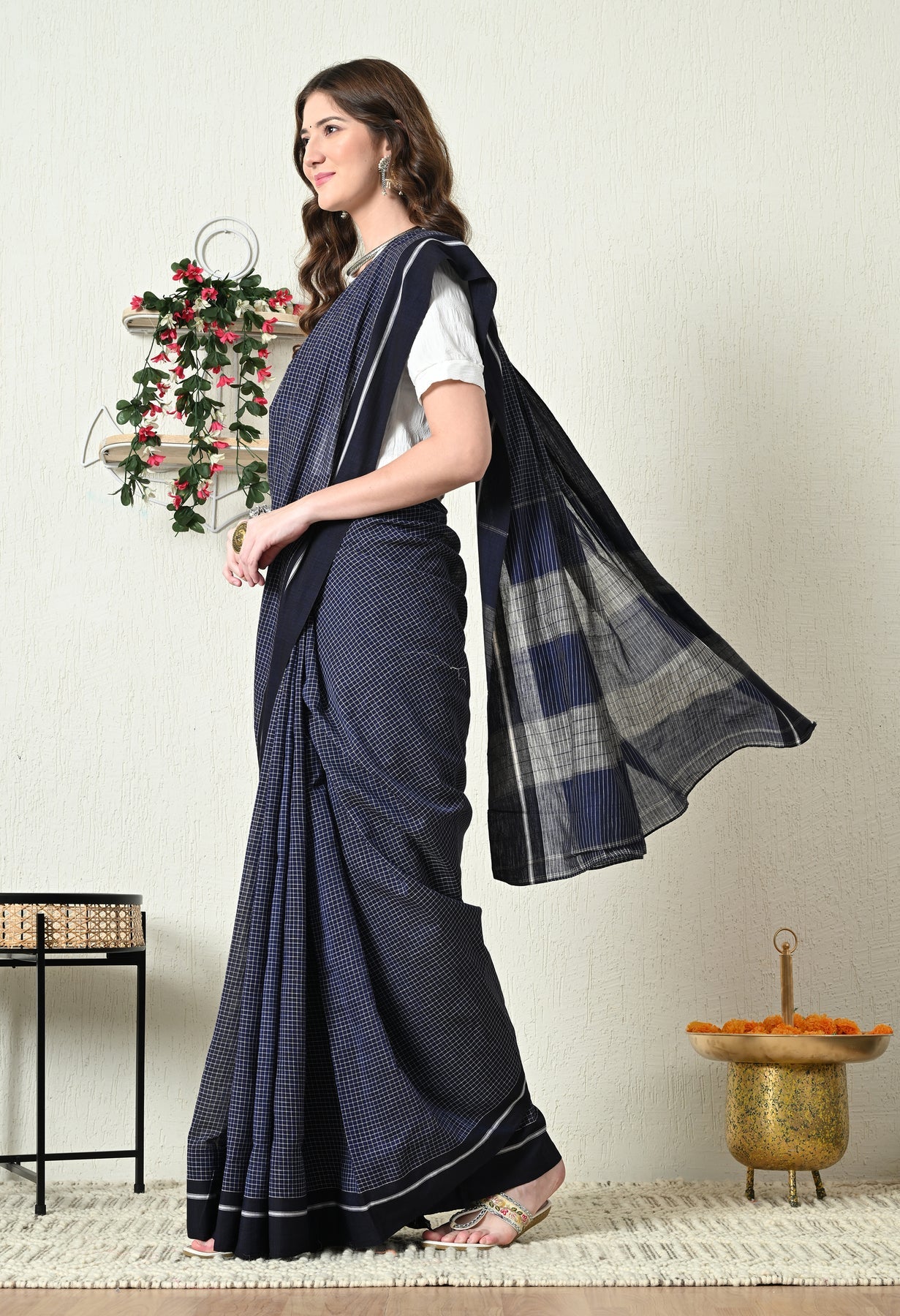 Neyge Ilkal Patteda Anchu Pure Cotton Elegant Checkered Pattern Plain Border Stripe Pallu - Black