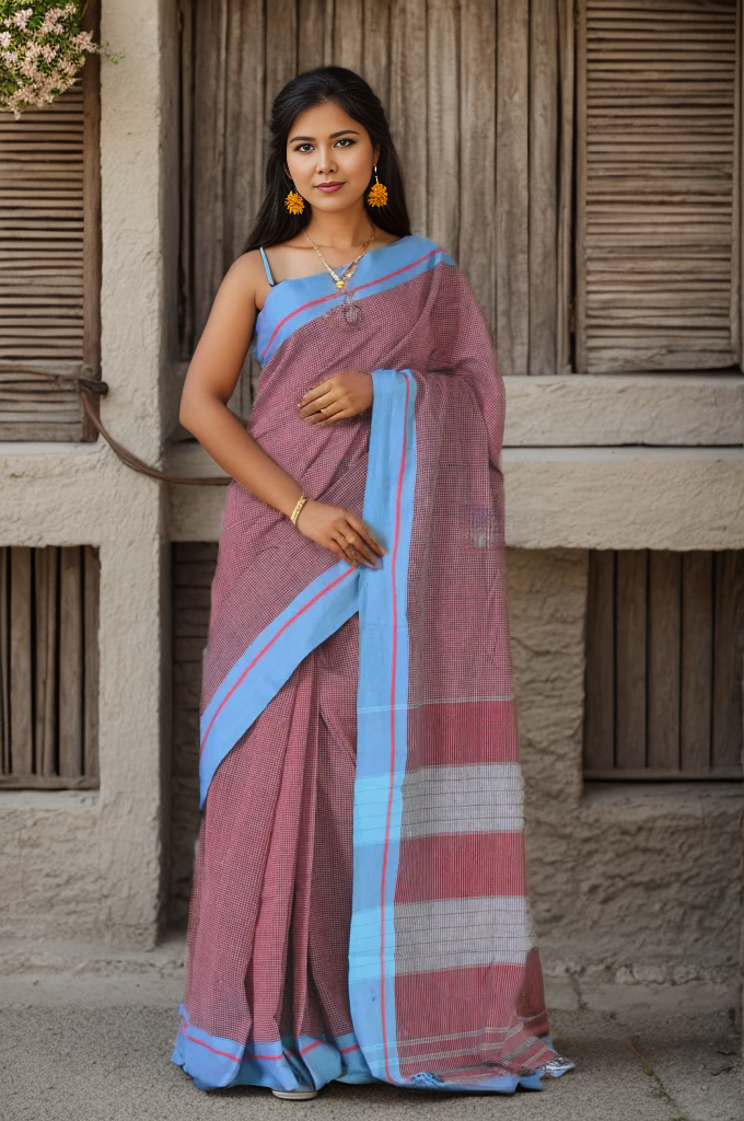 PATTEDA ANCHU weave from the 10th century! We are happy and proud to bring back the traditional sarees that have been worn in southern India since the 10th century. Pure Cotton Handloom - Eco-friendly colours - Reversible, wearable from either side - One saree takes 2 days to weave - Genuine Quality At weddings, this saree is presented to the local deity before being worn by the bride. This beautiful saree has a cotton weave, which can be recognised by its thickness, plain border, and subtle checks all throughout. Amazingly, this saree can be worn from either side, saving you the trouble of ironing and fall & beading. This saree was created with eco-friendly dyes.