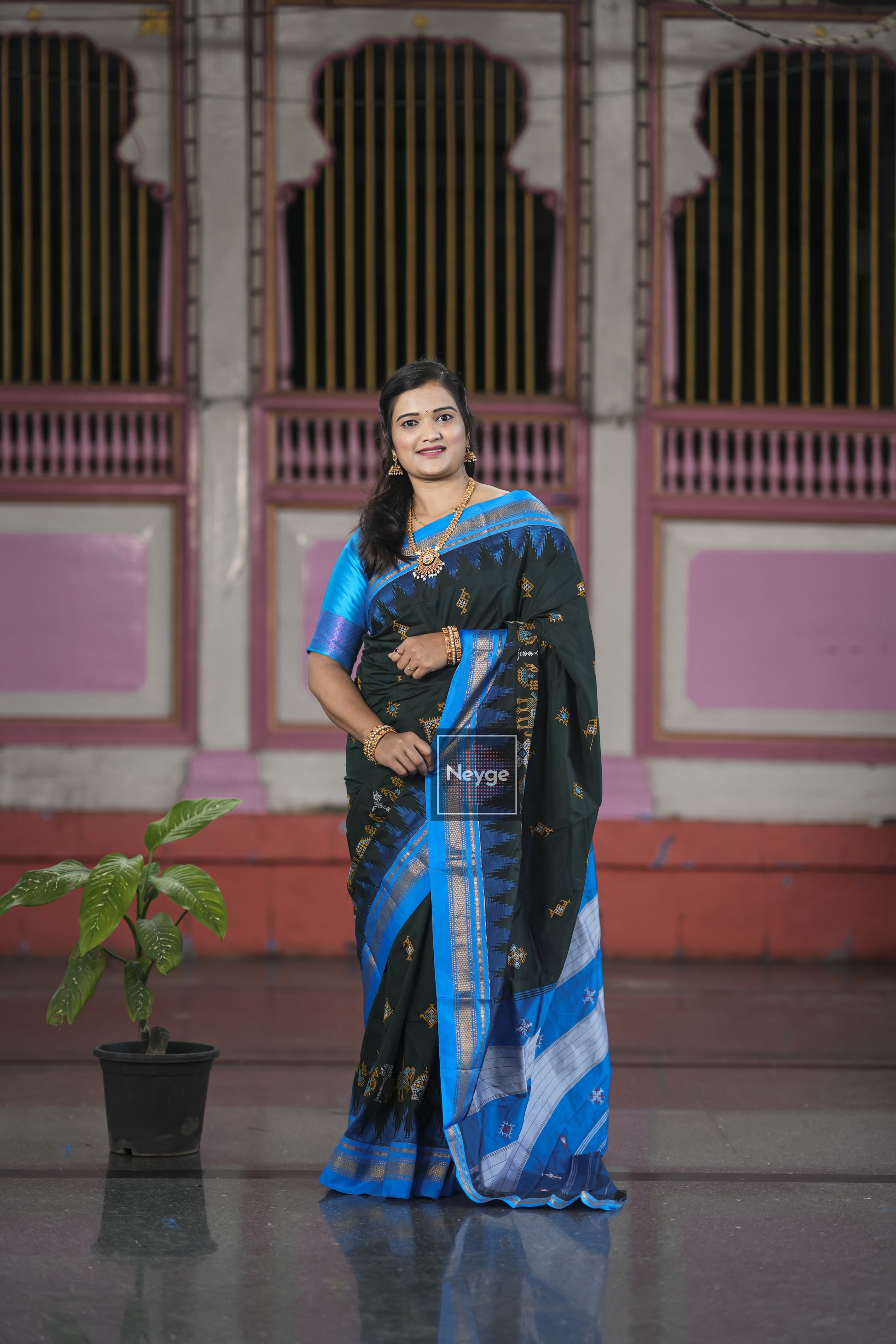Neyge Ilkal Pure Cotton Silk Dharwad Kasuti Saree Temple Gadwal Chikkiparas Border Tope Pallu Saree - Black