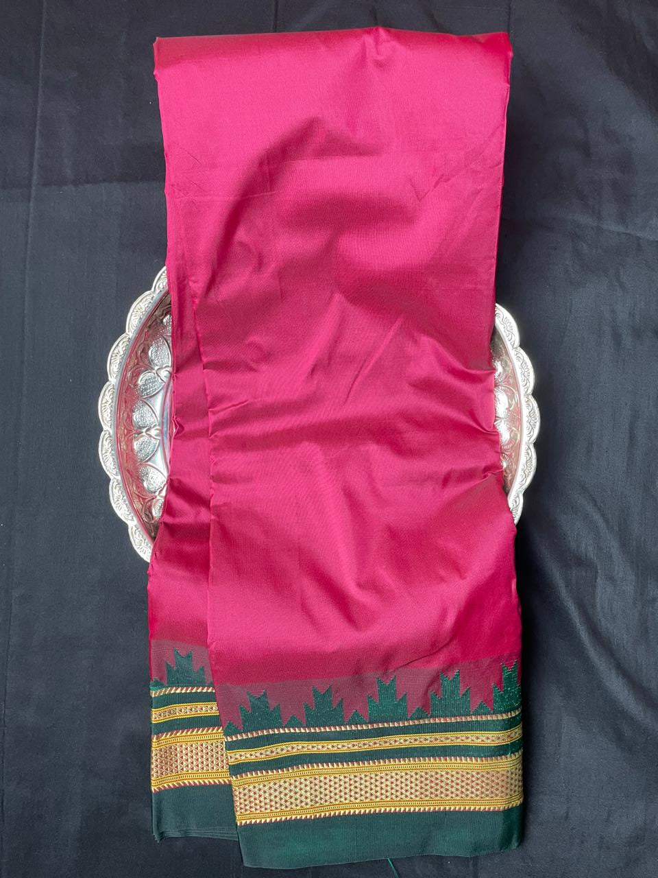 The graceful drape of this saree is complemented by traditional weaves known for its intricate and detailed usually done in vibrant colors. This Ilkal Pure Cotton silk saree has a Temple chikki paras border. The fabric is woven with Pure cotton and Tana silk saree looks cotton silky and feels like a silk saree. Whether it's summer or winter, they feel soft and nice against the skin.