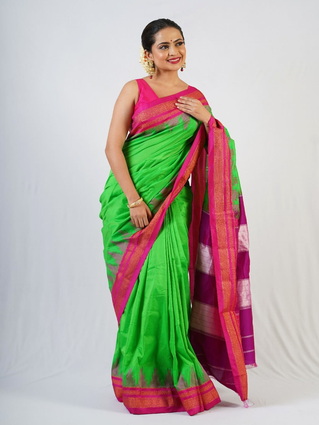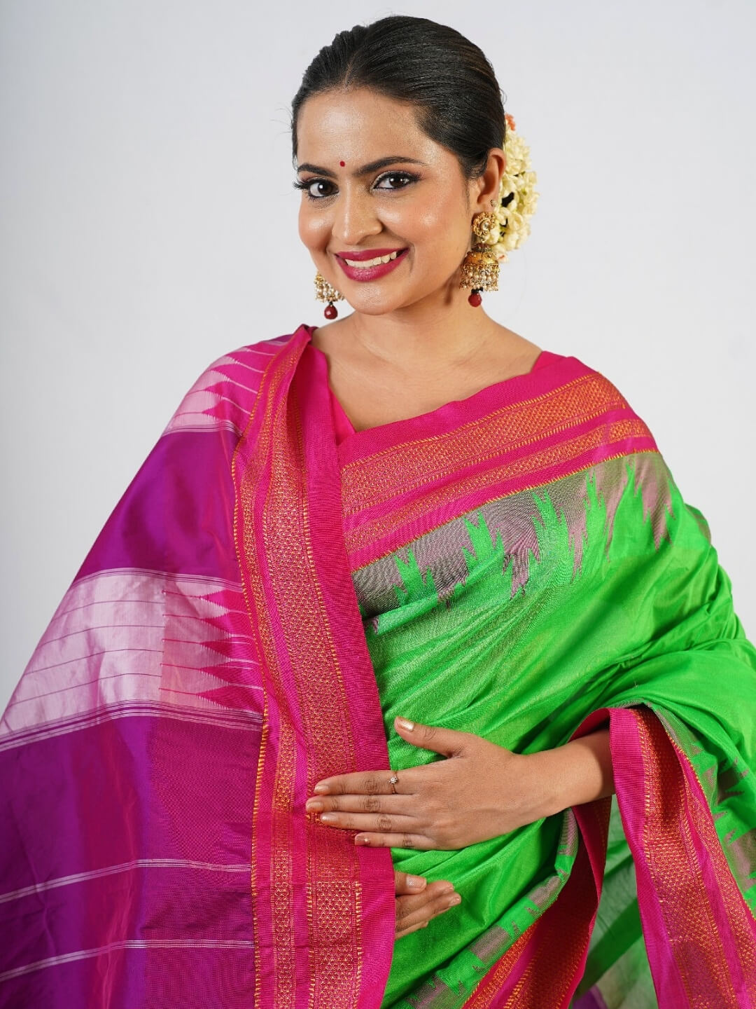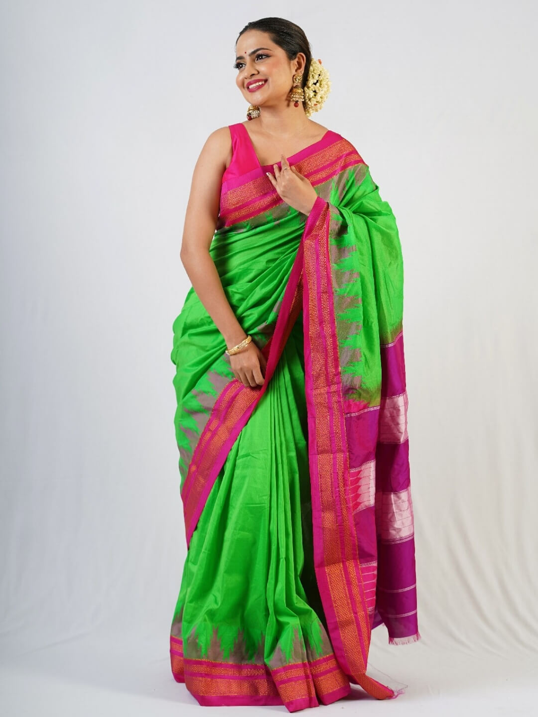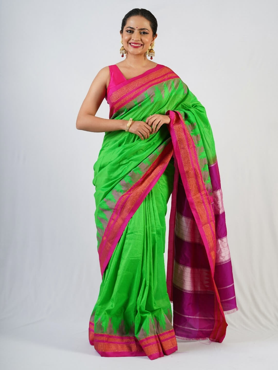 Neyge Ilkal Pure Cotton Silk Saree Temple Gadwal Chikkiparas Border Tope Pallu Saree - ParrotGreen