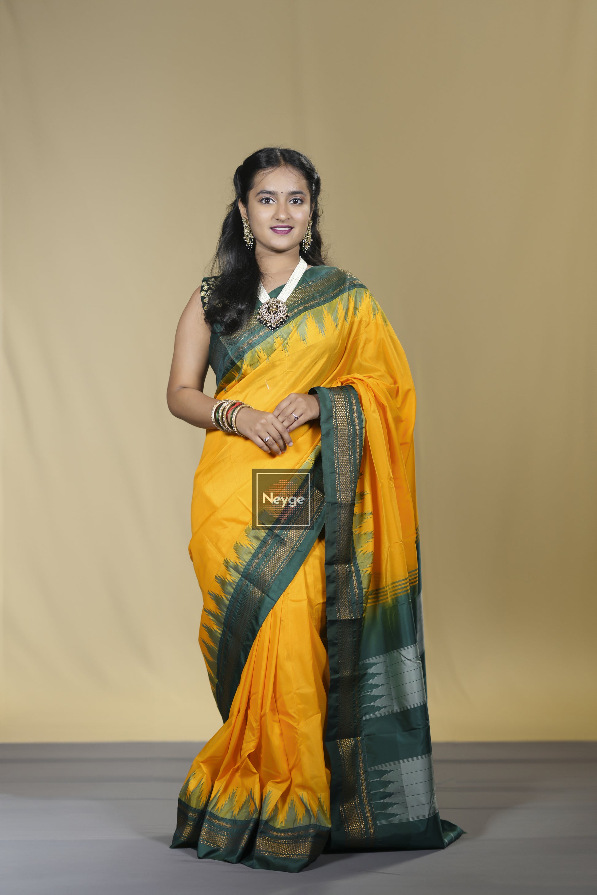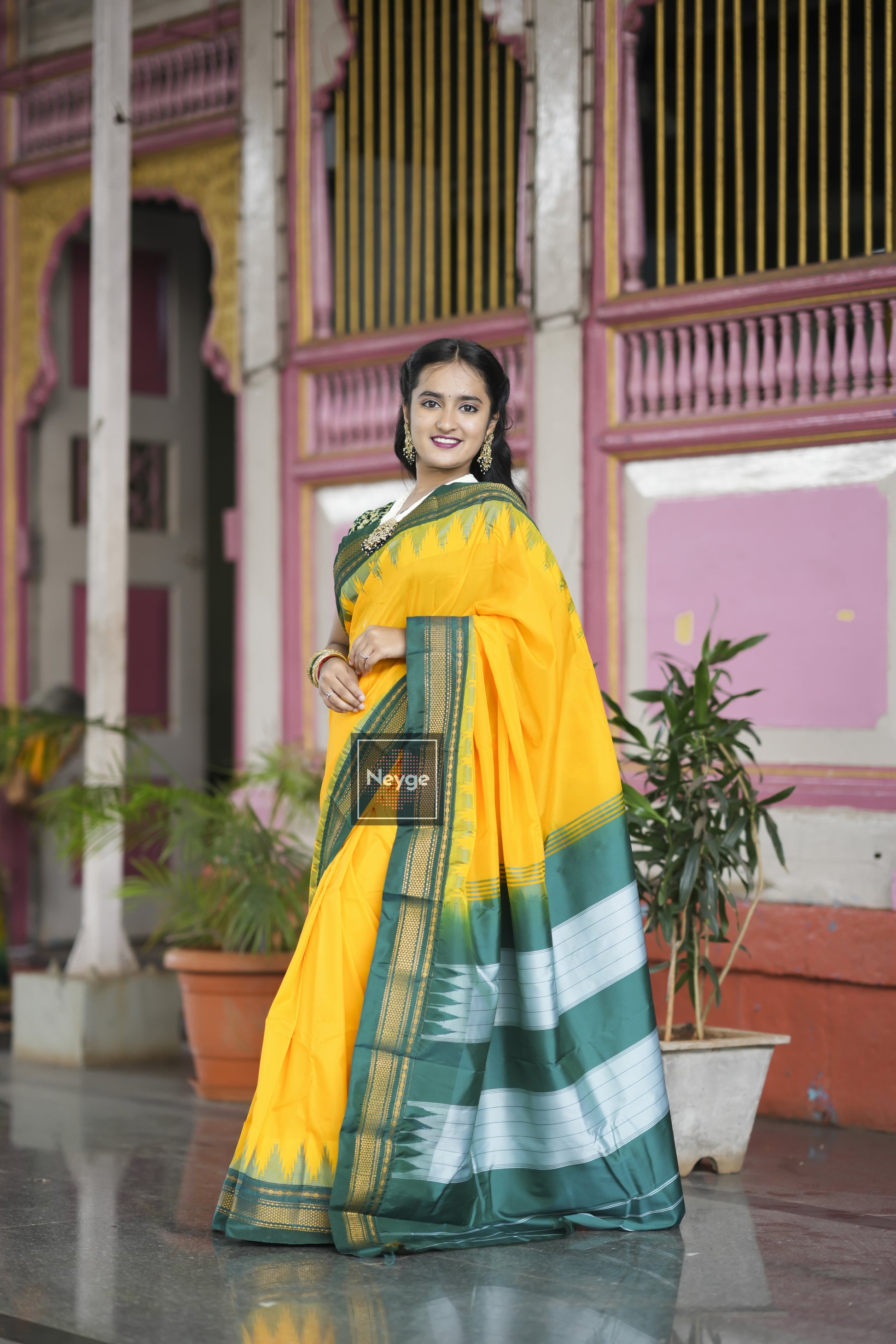 Neyge Ilkal Pure Cotton Silk Saree Temple Gadwal Chikkiparas Border Tope Pallu Saree - Yellow