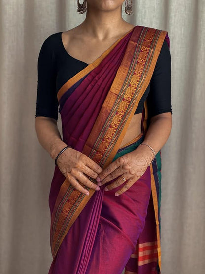Flaunt your style in this beautiful Narayanpet Pure Cotton saree with cotton thread work Elephant Motif Border design which gives it a simple traditional look. These sarees usually have a plain or solid-colored body, and the border and pallu feature intricate designs and patterns. The contrast between the body and the borders/pallu is a hallmark of Narayanpet sarees. Saree is woven with running blouse. Cotton thread work in the borders adds a touch of simple elegant look and suits for occasion like Festive, Wedding and Get Together.